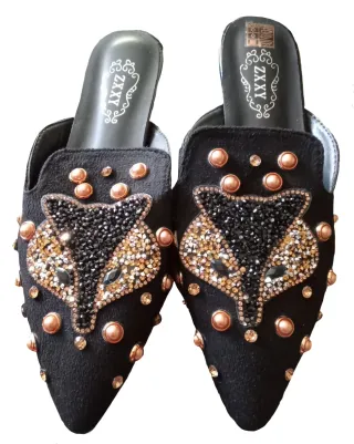 Sandalias de estilo mule con un diseño llamativo de zorro adornado con pedrería y tachuelas. - Diseño de zorro con pedrería negra y dorada. - Tachuelas metálicas en color cobre. - Punta afilada. - Tacón de bloque bajo.