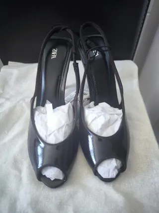 Elegantes sandalias de tacón de Zara. - Diseño con tiras finas y detalles dorados. - Tacón fino para un toque de altura. - Pala abierta con doble tira y hebilla.