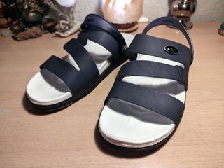 Sandalias compradas en Bali. Tira trasera ajustable. Muy cómodas. Muy buen estado, tienen poco uso, unicamente con marcas de uso en la suela. Talla 44. Color azul marino con blanco.