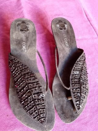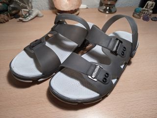 Sandalias compradas en Bali. Tira trasera ajustable. Muy cómodas. Muy buen estado, tienen poco uso, unicamente con marcas de uso en la suela. Talla 44. Color gris con blanco.