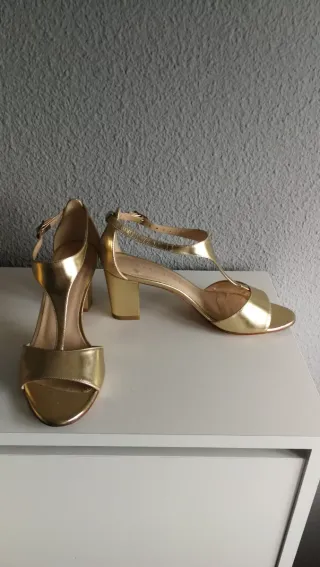 Elegantes sandalias doradas con tacón y tiras finas. - Usadas una sola vez - Diseño de tiras finas que se cruzan. - Cierre de hebilla en el tobillo. - Plataforma delantera.
