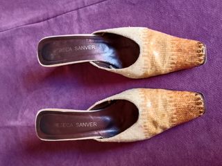 Sandalias de piel de la prestigiosa firma de calzado española Unisa, talla 40. Puestas sólo dos veces. Están como nuevas, como se ve en las fotos. Se atan con pulsera al tobillo. El dibujo de la piel de este calzado es una especie de 'print animal' en tonos marrones. 9 centímetros de altura de su cuña, efecto madera, a los que hay que descontar 4 centímetros de la plataforma delantera. Muy cómodos.
