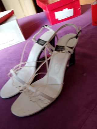 Elegantes sandalias de fiesta con tacón alto y plataforma. - Material exterior de raso. -Plantilla de Piel. - Diseño cruzado en tiras. - Cierre con pulsera al tobillo. Poco usadas, sólo dos bodas.
