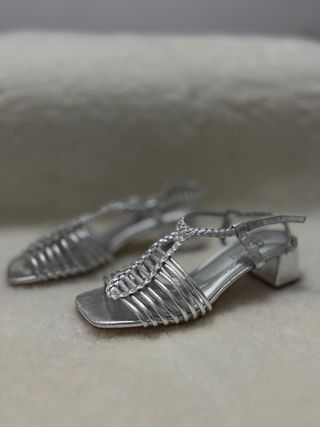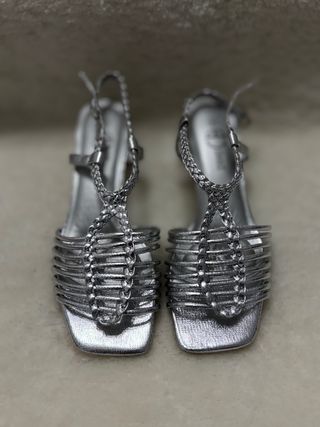 Elegantes tacones plateados con un diseño de tiras entrelazadas. - Diseño de tiras trenzadas. - Acabado metálico brillante.
