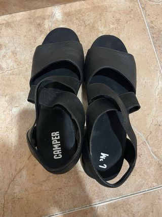 Sandalias de cuña Camper en color negro y azul marino. - Diseño moderno y cómodo. - Tira ajustable en el tobillo. - Plataforma de cuña.