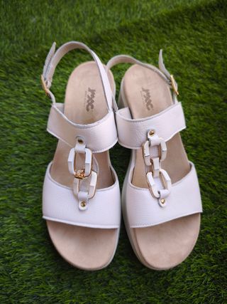 Sandalias blancas de la marca iMac, ideales para el verano. Son sandalias con un diseño elegante y cómodo. - Hechas de cuero blanco. - Tienen una plataforma cómoda. - El cierre es con hebilla. De horma ancha. Usados una sola vez defecto en las hebillas decorativas estado en momento de compra.