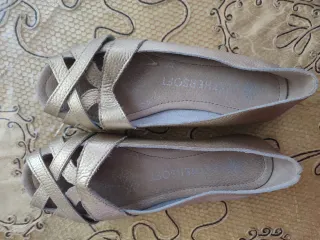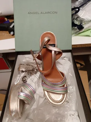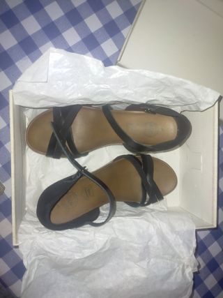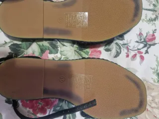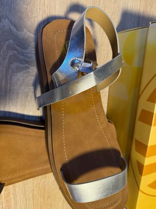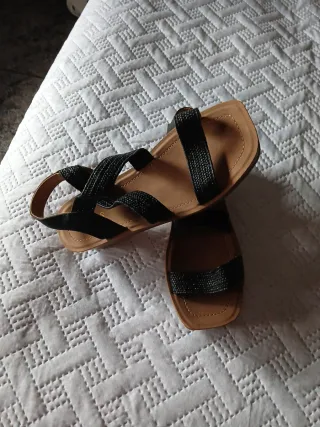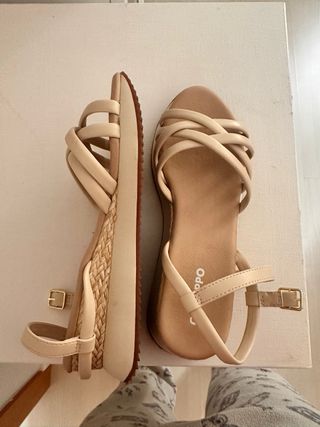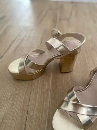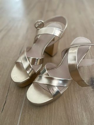 Elegantes sandalias doradas con un diseño cruzado. - Material exterior: Piel. - Diseño abierto en la punta. - Suela cómoda. Sigue teniendo hasta el plástico que traía enganchado, no lo corto para demostrar que nunca se han utilizado