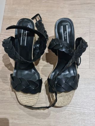 Sandalias de cuña con diseño trenzado. - Material exterior de piel. - Cierre con hebilla. - Suela de esparto.