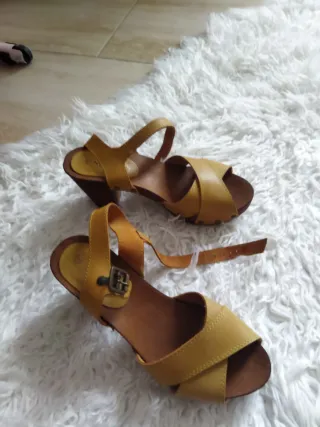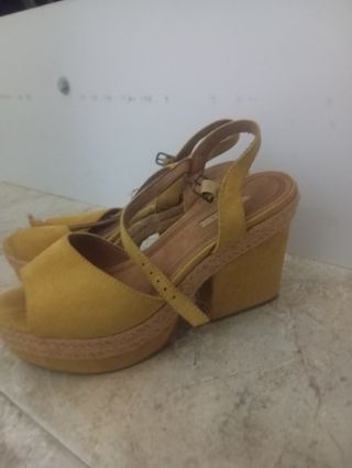 Sandalias de cuña en color mostaza, perfectas para añadir un toque de estilo. - Material exterior tipo ante. - Correa ajustable al tobillo. - Plataforma delantera. - Cuña con acabado de esparto.
