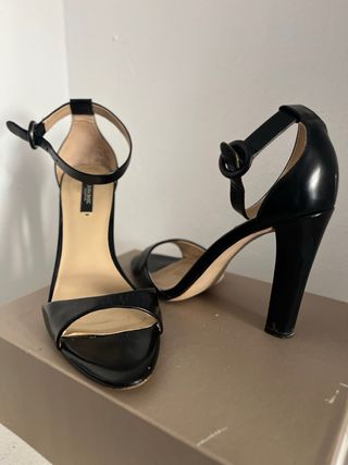 Elegantes sandalias de tacón de Zara. Polipiel Altura tacón 10 cm - Diseño de tiras finas. - Cierre de hebilla al tobillo. - Tacón grueso y alto.