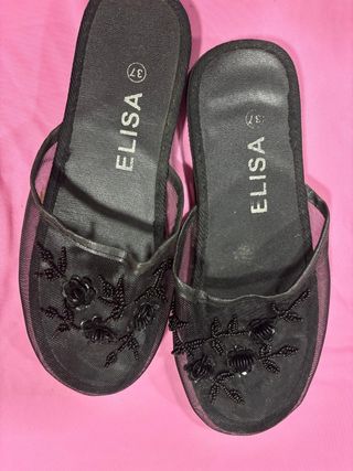 Sandalias de malla negra con adornos florales y pedrería. - Diseño abierto. - Adornos de flores y cuentas. - Suela cómoda.