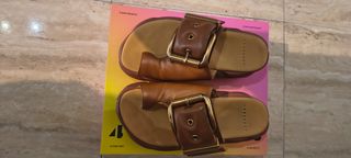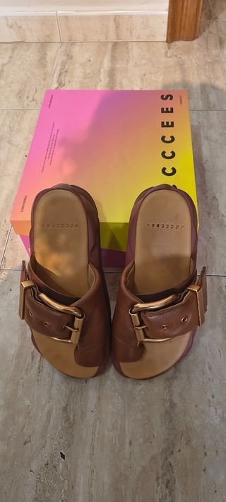 Sandalias de la marca 4cccees con un diseño moderno y casual. Super cómodas , calza un pelín grande. Nº39. Poco uso. Color cuero con hebilla dorado bronce. - Tira ancha con hebilla dorada. - Material de cuero. - Suela cómoda.