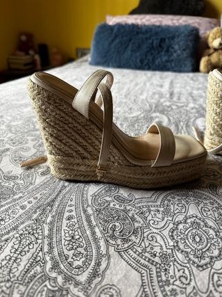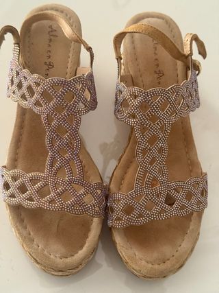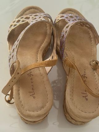Sandalias plataforma de color dorado, ideales para cualquier ocasión. Con un diseño elegante y sofisticado. - Diseño entrelazado con brillantes. - Hebilla de cierre. - Suela de esparto. - Nuevas a estrenar.