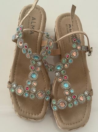 Sandalias de tiras adornadas con pedrería multicolor. - Diseño con pedrería en tonos pastel y turquesa. - Tira de tobillo con cierre de hebilla. - Suela de esparto y plantilla cómoda.