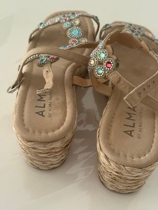 Sandalias de cuña con un diseño elegante y adornos brillantes. - Tira frontal con detalles de pedrería. - Cierre de hebilla ajustable. - Suela de esparto.