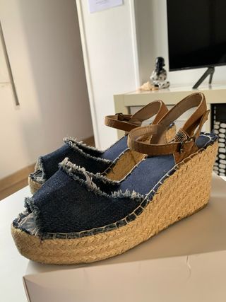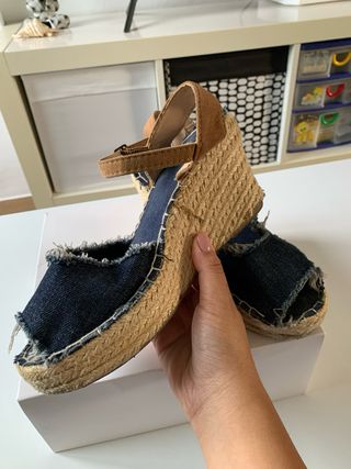 Sandalias de cuña con un diseño moderno y veraniego. - Material exterior de denim con acabado deshilachado. - Plataforma de esparto. - Tira de sujeción en tono marrón.