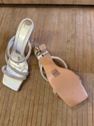 Elegantes sandalias plateadas, perfectas para eventos especiales. - Diseño con tiras adornadas con pedrería. - Tacón fino. - Punta cuadrada.