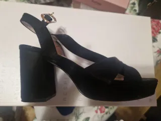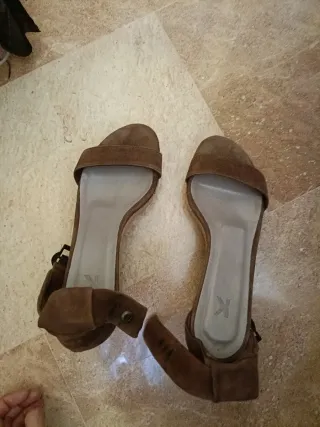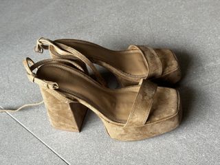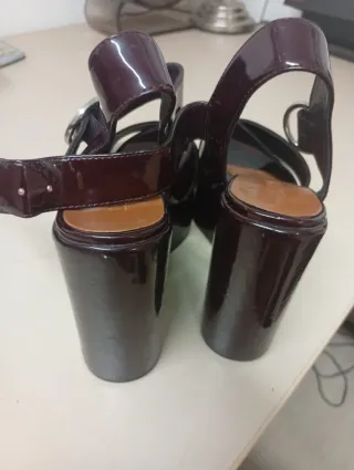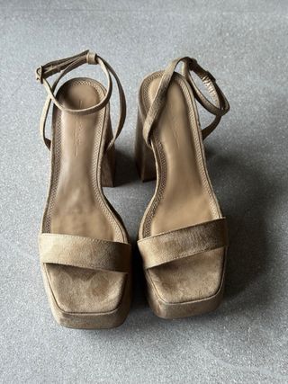 Sandalias de tacón con plataforma en color marrón. Nuevas sin usar. - Material efecto ante. - Cierre con tira fina al tobillo. - Tacón cuadrado.