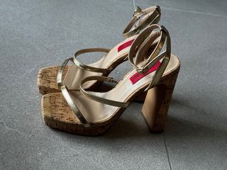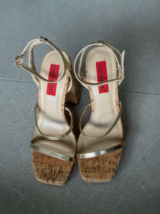 Sandalias de tacón usadas una sola vez. - Tira fina dorada en la pala. - Correa ajustable al tobillo. - Tacón y plataforma forrados de corcho. - Pesan muy poco