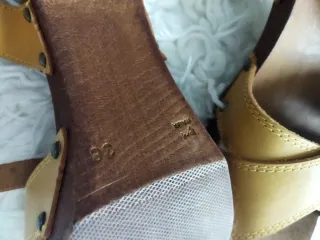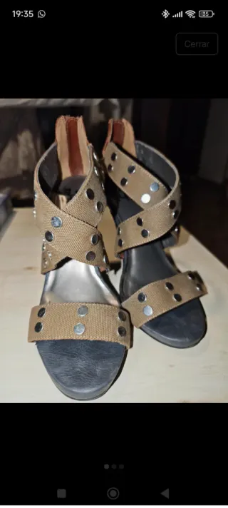 Sandalias de tacón con tiras de lona de color caqui adornadas con remaches metálicos redondos. La parte interna de las tiras está un poco agrietada por el paso de los años, no por uso. Me las habré puesto en 2 ocasiones.