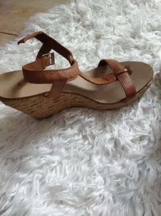 Sandalias de cuña Timberland en color marrón para mujer. Un diseño elegante y cómodo. - Tiras cruzadas en la parte delantera. - Cierre con hebilla ajustable en el tobillo. - Plataforma de esparto. -comprados en Holanda hace 5 años y usados muy muy poco.