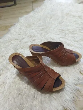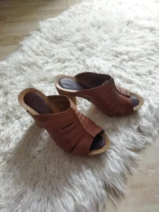 Preciosas Sandalias de tacón con un diseño abierto y tiras de cuero. - Material exterior de cuero. - Tacón de madera. - Diseño tipo mule. ENVIO solo a punto de recogida