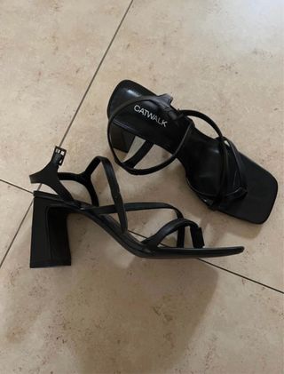 Elegantes sandalias negras de la marca Catwalk. - Diseño con tiras finas. - Tacón cuadrado y robusto. - Cierre de hebilla en el tobillo.