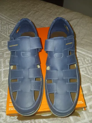 Sandalias de verano en color azul. 1 solo uso. - Talla 44. - Diseño abierto tipo pescador. - Cierre de velcro. - Costuras blancas decorativas.
