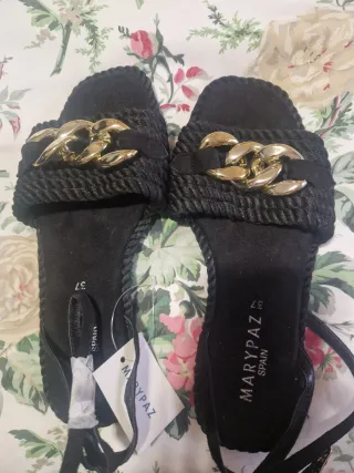 Sandalias de la marca Marypaz en color negro y detalle de cadena dorada. - Diseño con tira frontal adornada con eslabones dorados. - Tira trasera para un ajuste seguro. - Acabado en material similar al ante.