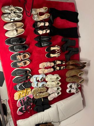 Lote de calzado variado que incluye botas, zapatillas deportivas y sandalias. - Botas altas negras. - Botines negros. - Zapatillas deportivas - Sandalias - Chanclas negras. - Zapatos planos - Sandalias de - Zapatos de tacón