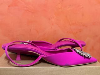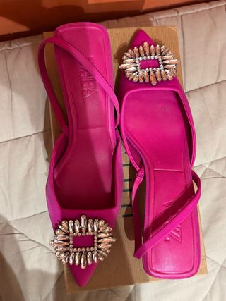 Preciosas sandalias de tacón de Zara, talla 40, en color rosa. Son de un tejido satinado y tienen un detalle de pedrería en la parte delantera. Ideales para cualquier ocasión especial. - Tacón fino. - Diseño elegante. - Detalle de brillantes.