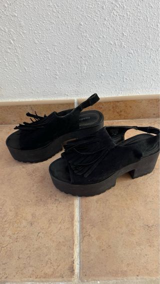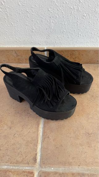 Sandalias de plataforma con un diseño moderno y atrevido. - Material de ante. - Detalle de flecos en la pala. - Cierre con tira elástica en el talón. - Plataforma gruesa con tacón cuadrado.