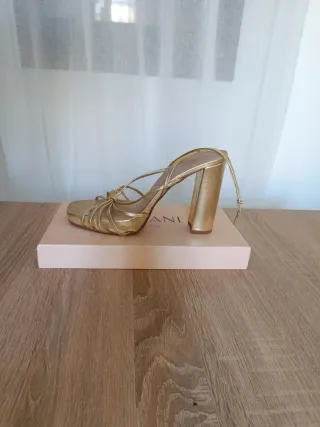 Elegantes sandalias de tacón de la marca Bimani Madrid. - Diseño con tiras finas. - Tacón grueso. - Acabado metalizado brillante. - Utilizados solo el día de mi boda. - Precio original 150€.