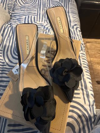 Elegantes tacones de la marca Corina con un diseño llamativo. - Tira transparente. - Adorno de flor en la punta. - Tacón fino.