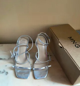 Elegantes sandalias plateadas de Mango con tiras finas y detalle de hebilla. Número 37 Nuevas en caja con etiqueta. Presentan algunos defectos de fabricación como se puede ver en las fotos. Gastos de envío por cuenta del comprador. No se hace contra reembolso - Diseño de punta cuadrada. - Cierre de hebilla ajustable al tobillo. - Tacón fino.