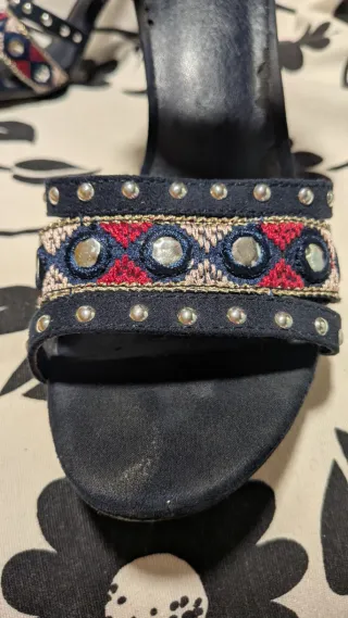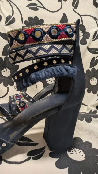 Sandalias de tacón alto con un diseño muy especial. - Tiras decoradas con bordados, espejos y tachuelas. - Detalle de flecos en la tira superior. - Tacón grueso y cuadrado.