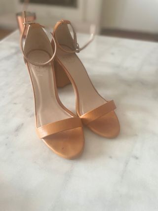 Elegantes sandalias de tacón en color camel. Tacón 8 cm , algun roce en el tacón pero buen estado. - Diseño de tiras finas. - Cierre con pulsera al tobillo. - Tacón ancho para mayor comodidad.