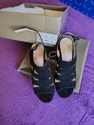 Elegantes sandalias negras con tiras y tacón. - Material: ante. - Cierre con hebilla. - Diseño abierto.