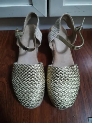 Sandalias de cuña con un diseño trenzado en la parte delantera. - Material exterior dorado y beige. - Cierre de hebilla en el tobillo.