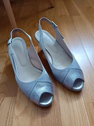 Elegantes sandalias de tacón con un diseño peep toe. - Acabado plateado brillante. - Tira ajustable en el talón. - Detalle de chevron en la punta.