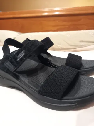 Sandalias Skechers en color negro. Perfectas para el día a día. - Diseño con tiras de tela. - Cierre de velcro ajustable. - Suela cómoda y ligera.