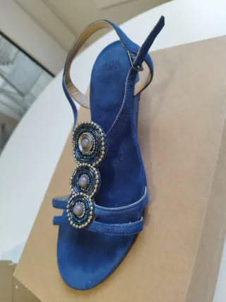 Sandalias azules, muy poco uso. Tienen una pequeña cuña y detalle de pedrería en el empeine. Tira ajustable alrededor del tobillo. - Detalle de pedrería y cuentas. - Cierre de tira con hebilla. - Material: Ante.