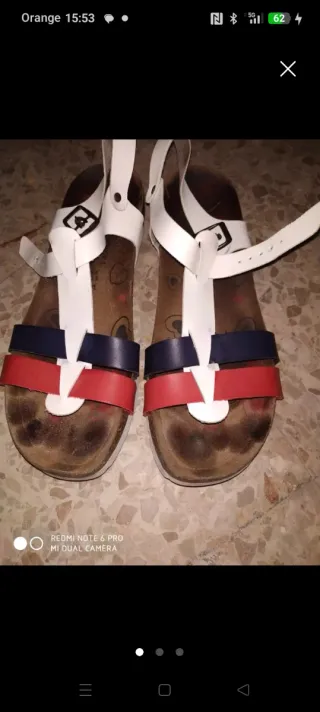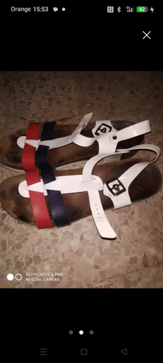 Sandalias de mujer con diseño T-Strap. - Tiras en color blanco, azul marino y rojo. - Suela de corcho con plantilla. - Cierre de hebilla ajustable , envío x Wuallapop.