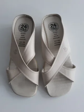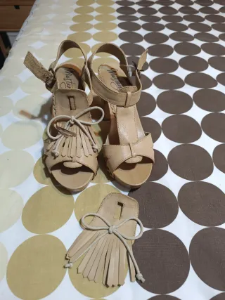 Sandalias de cuña con un diseño elegante y cómodo. - Material exterior de piel. - Tira delantera con detalle de perforaciones y tachuelas. - Cierre de velcro en la tira trasera. - Cuña con acabado trenzado. Muy cómodas y con apenas uso. Vendo por no poder llevar tanto tacón por una patología del pie.