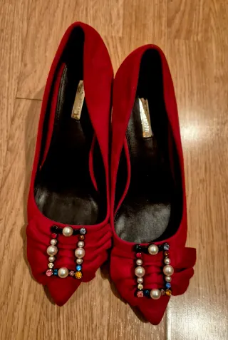 Elegantes tacones rojos con un diseño llamativo. - Adorno frontal con perlas y pedrería multicolor. - Material de ante. - Detalle de lazo lateral,cómodos y muy ponibles.