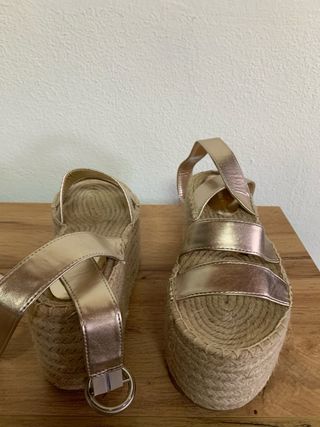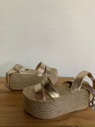 Sandalias con plataforma alta forrada en yute, estilo flatform, con tiras metálicas doradas. Muy cómodas y ligeras, perfectas para el verano. A estrenar mas zapatos en mi perfil. sandalias de tacon / alpargatas / espadrilles