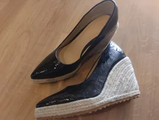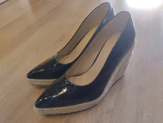 Elegantes salones con tacón de cuña yute. - Acabado brillante. - Punta fina. - Detalle de yute en la suela.
