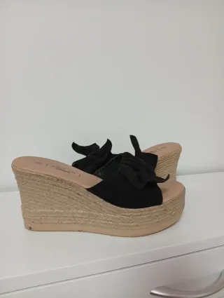 Sandalias de cuña con un diseño elegante y cómodo. - Pala negra con detalle de lazo. - Cuña forrada de esparto. - Suela de goma.