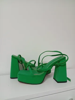 Sandalias de plataforma con tacón alto y tiras finas. - Diseño moderno y llamativo. - Tacón cuadrado y robusto. - Cierre con tiras al tobillo.