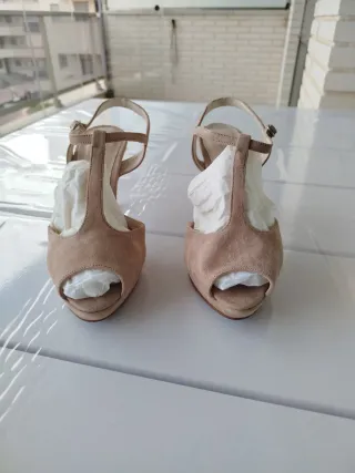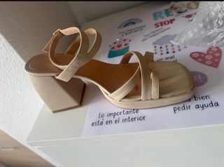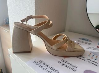 Preciosas sandalias de tacón fino de Zara, en color beige y talla 39. Son ideales para cualquier ocasión. - Diseño elegante y sofisticado. - Material ligero y cómodo. - Perfecto estado. Medida del pie: 25 cm